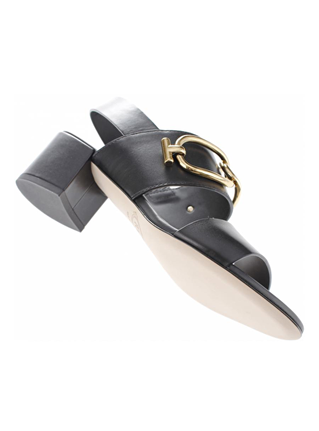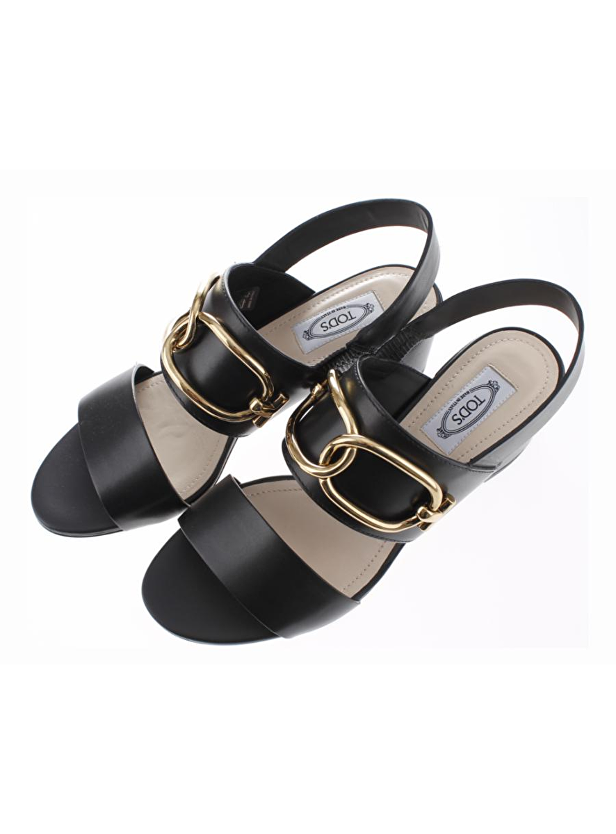 Mooie vrouwelijke sandalettes van Tod's. De schoen is uitgevoerd in zwart leder. De hakhoogte is 7cm. 2 brede lederen banden lopen over de wreef en het smalle bandje wat aan de enkel gedragen wordt is ook van leder. De grote gouden gesp is echt een eyecatcher. De buitenzool is van leder en de onderkant van de lederen hak is rubber. Fijn, comfortabel en vrouwelijk mooi!