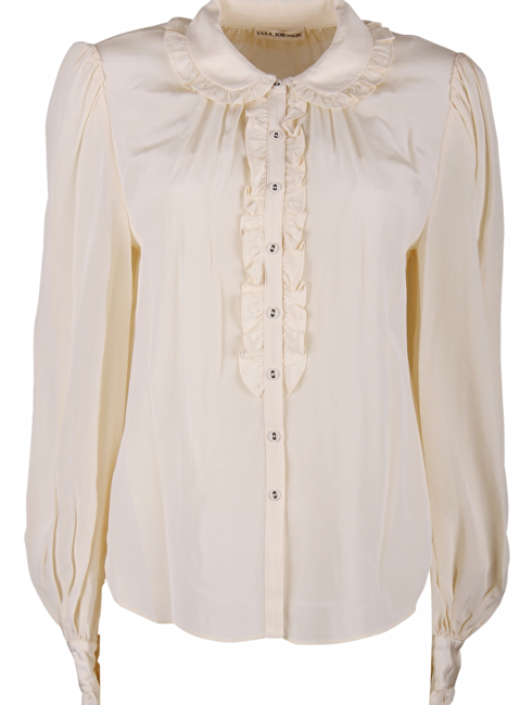 offwhite blouse met roezelrand kraag, voorkant knopenrand en manchetten. Afgeronde zoom.