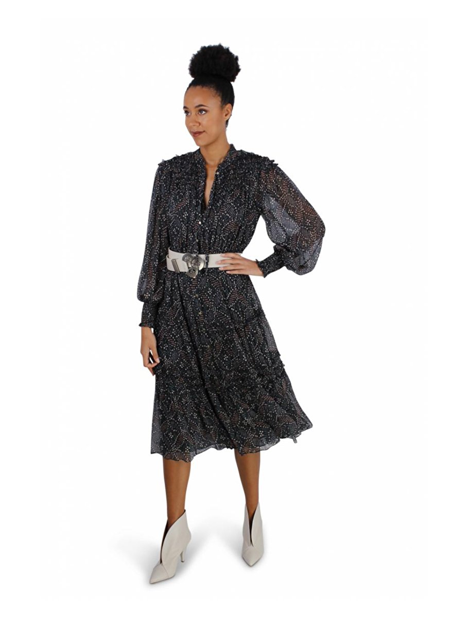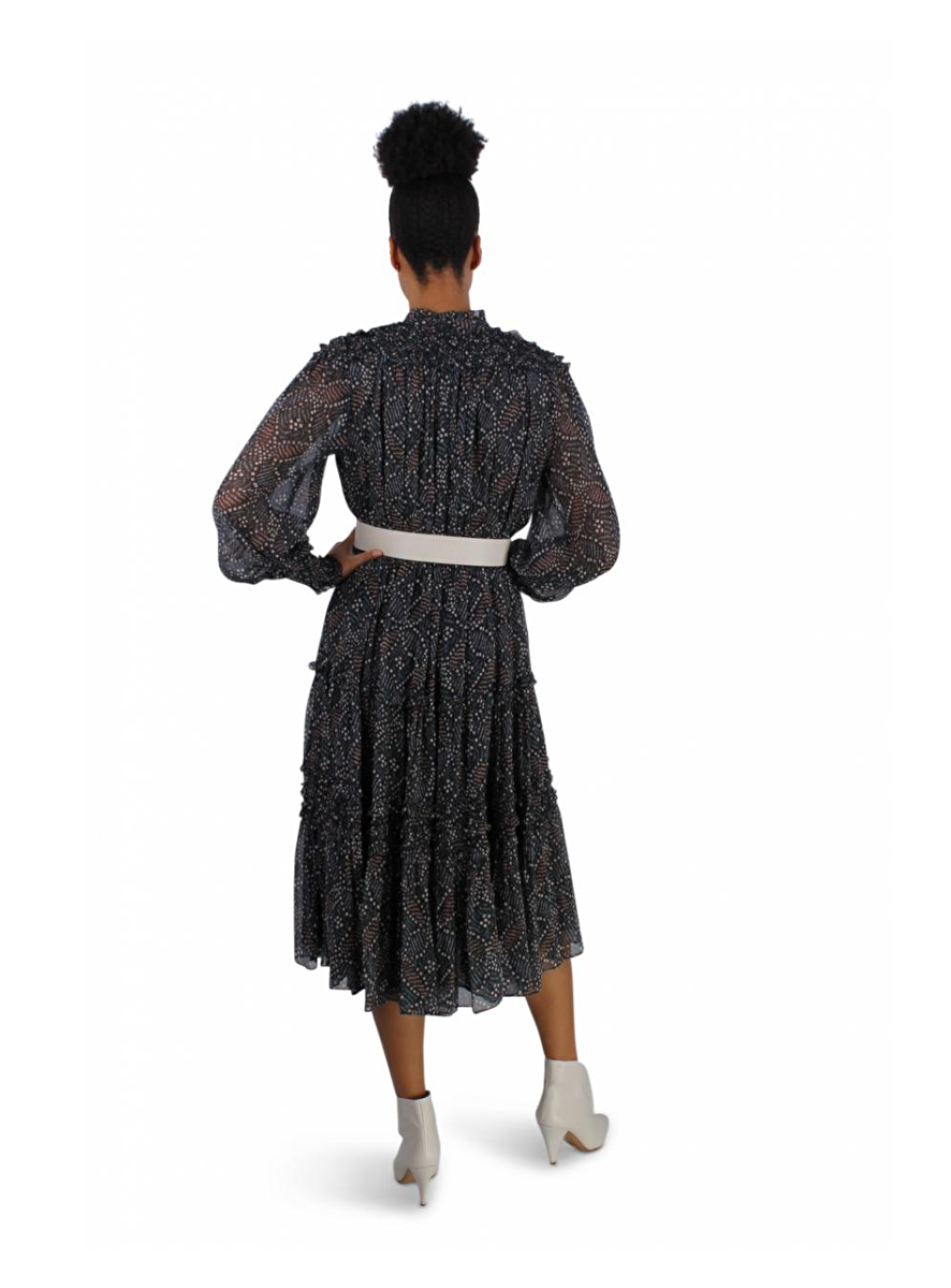 Jurk Briele met abstract dessin, striklint hals, volants op de schouder en onderkant zoom. Elastische taille en manchetten mouwen. Knoopjes sluiting aan de voorkant. Licht gevoerd.