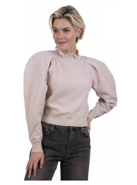 Beige pull met een krinkel gebreide col en pofmouwen. Structuur Wol.