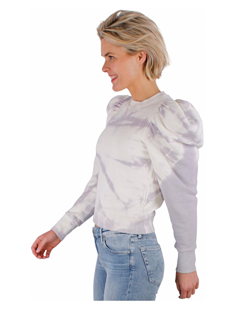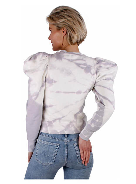 Pull tie dye met ronde hals en pofmouwen. linker mouw heeft een effen kleur aan de onderarm.