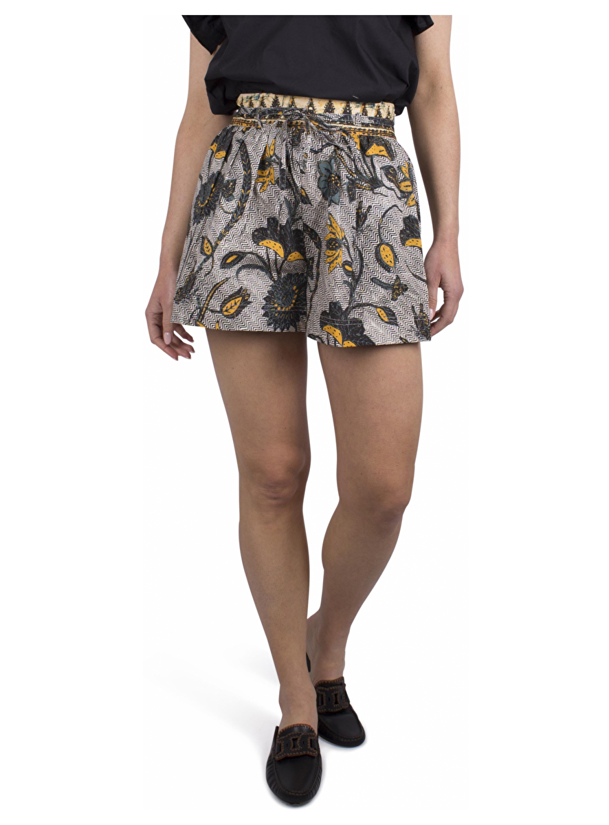 Short met bloemenprint in geel, groen en offwhite. Stoffen strikkoord. Zakken. Ritssluiting in de zij.