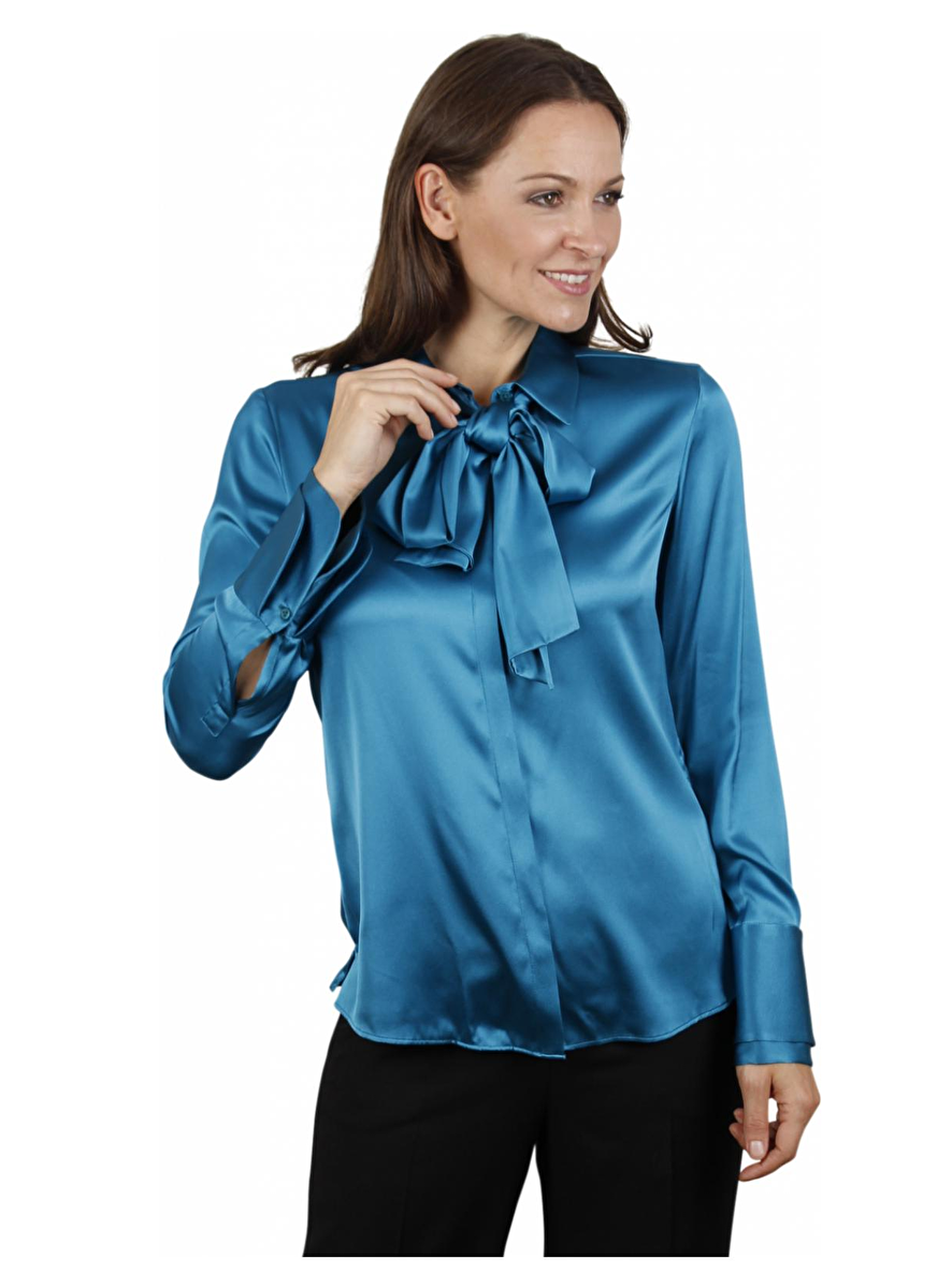 Blouse in petrol blauw met strik en lange dubbele afgeronde manchetten. Deze sluit aan  (getailleerd) met knopen in een blinde zoom. Mooie warme kleur.
