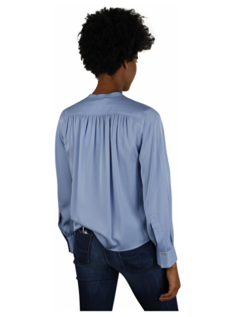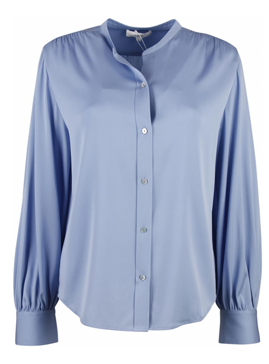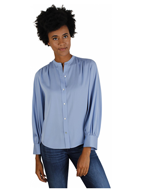 Dit is één van die Vince blouses waar we blij van worden. Mooi zacht blauw in een mat glanzende zijde. Deze heeft een ronde hals met een smal boordje. Heel leuk om dicht te dragen maar kan natuurlijk ook een stukje open voor het nonchalante effect. Het model is recht en aan de schouders licht geplooid. Dit effect komt ook terug op de manchetten van de mouwen. Mooi!