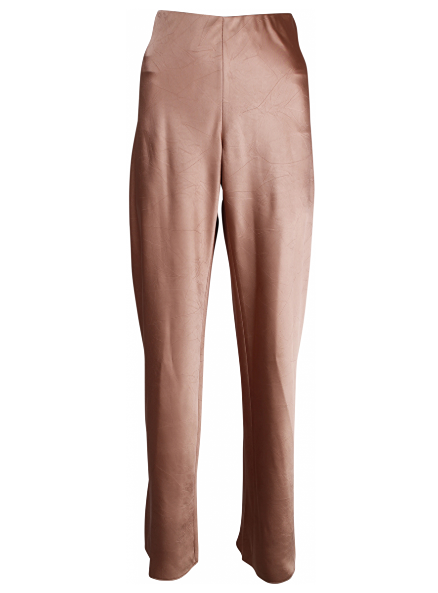 Broek met elastische taille en glans kreuk dessin in poeder roze. Rechte broekspijpen.