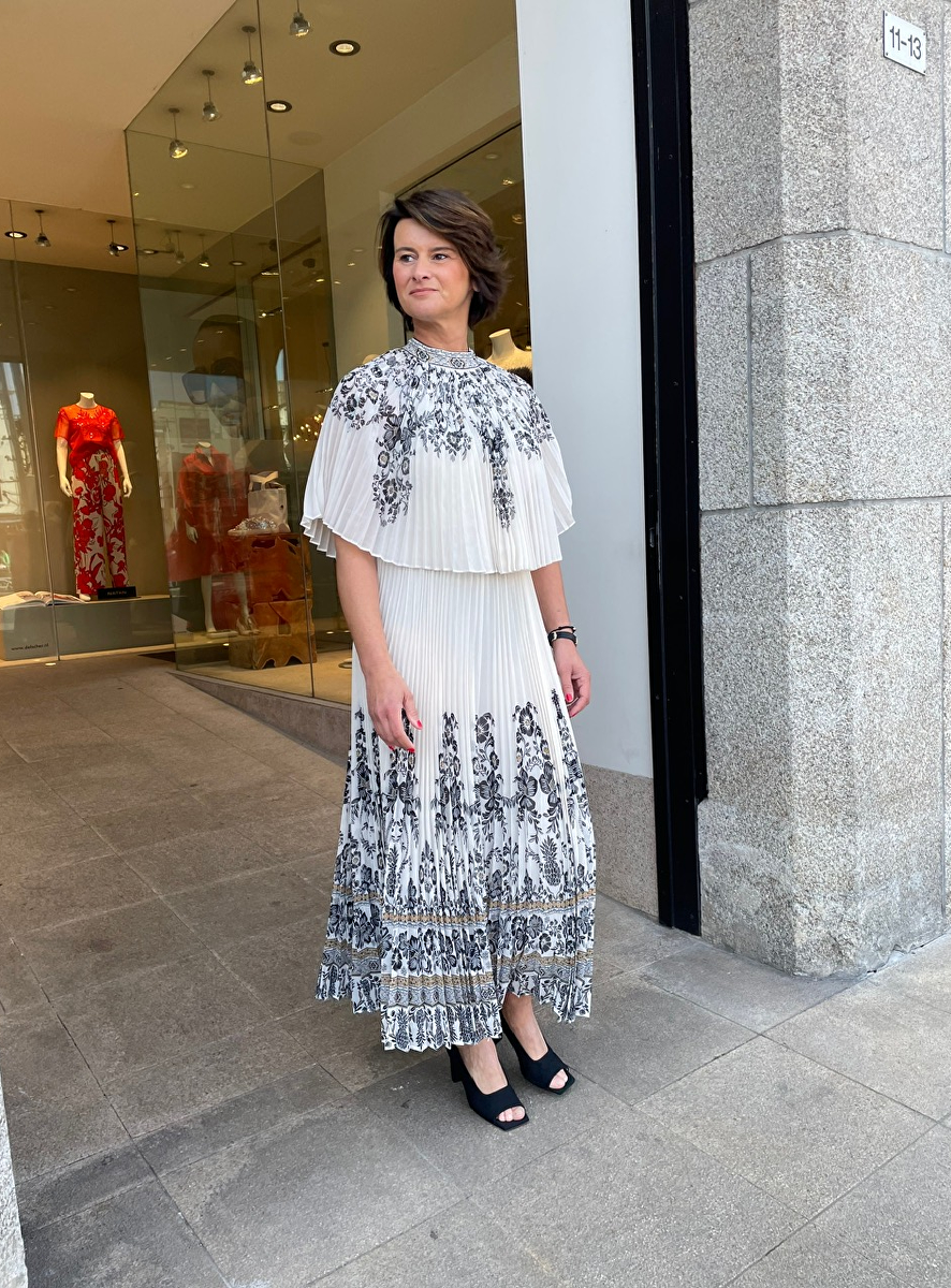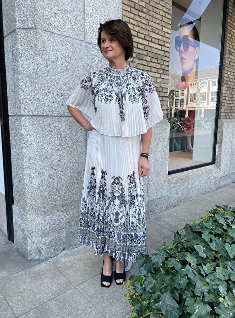 jurk heeft glad bovenlijfje en geplisseerde rok